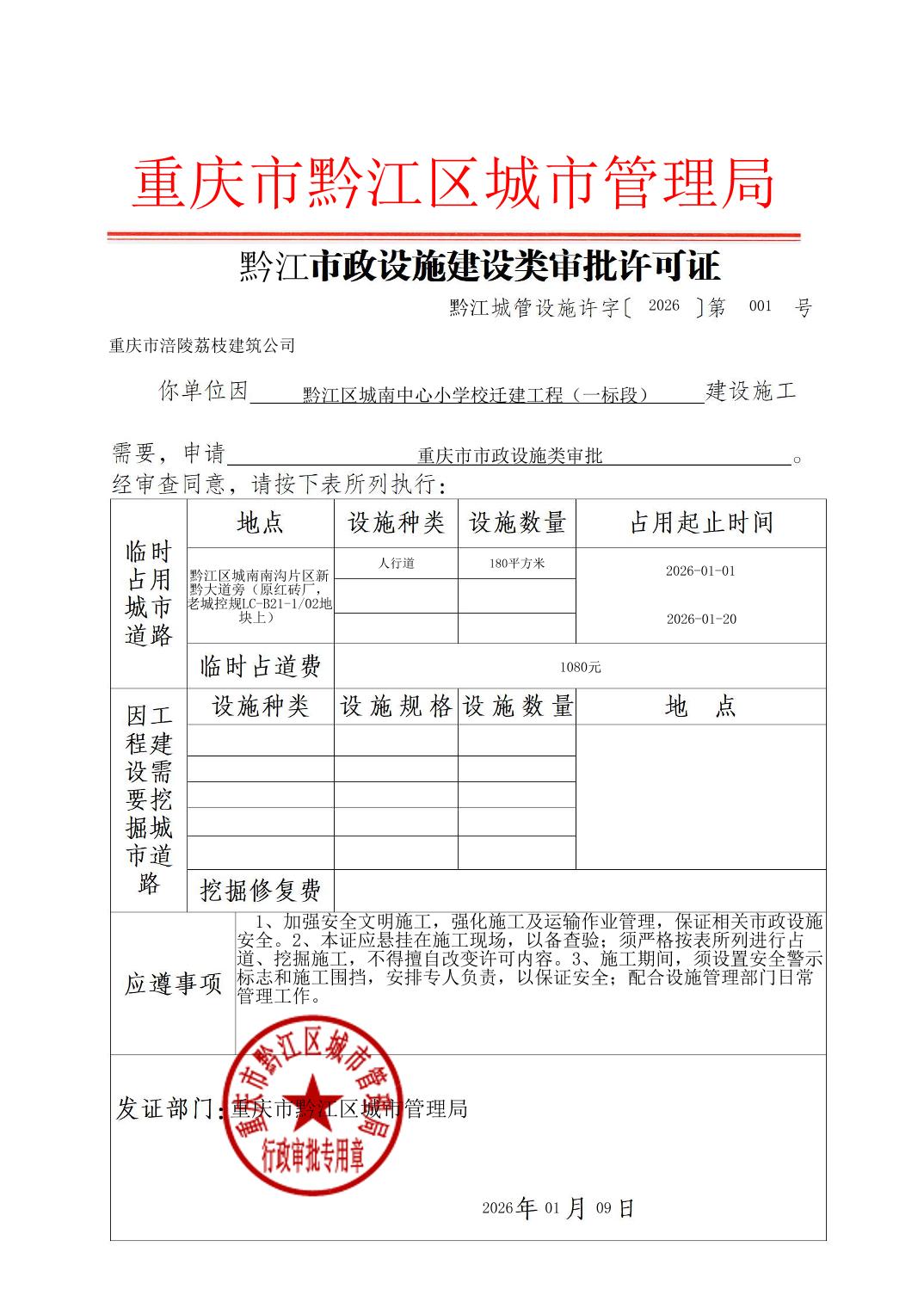 市政行政審批許可證(市政設(shè)施(2026)第01號)
