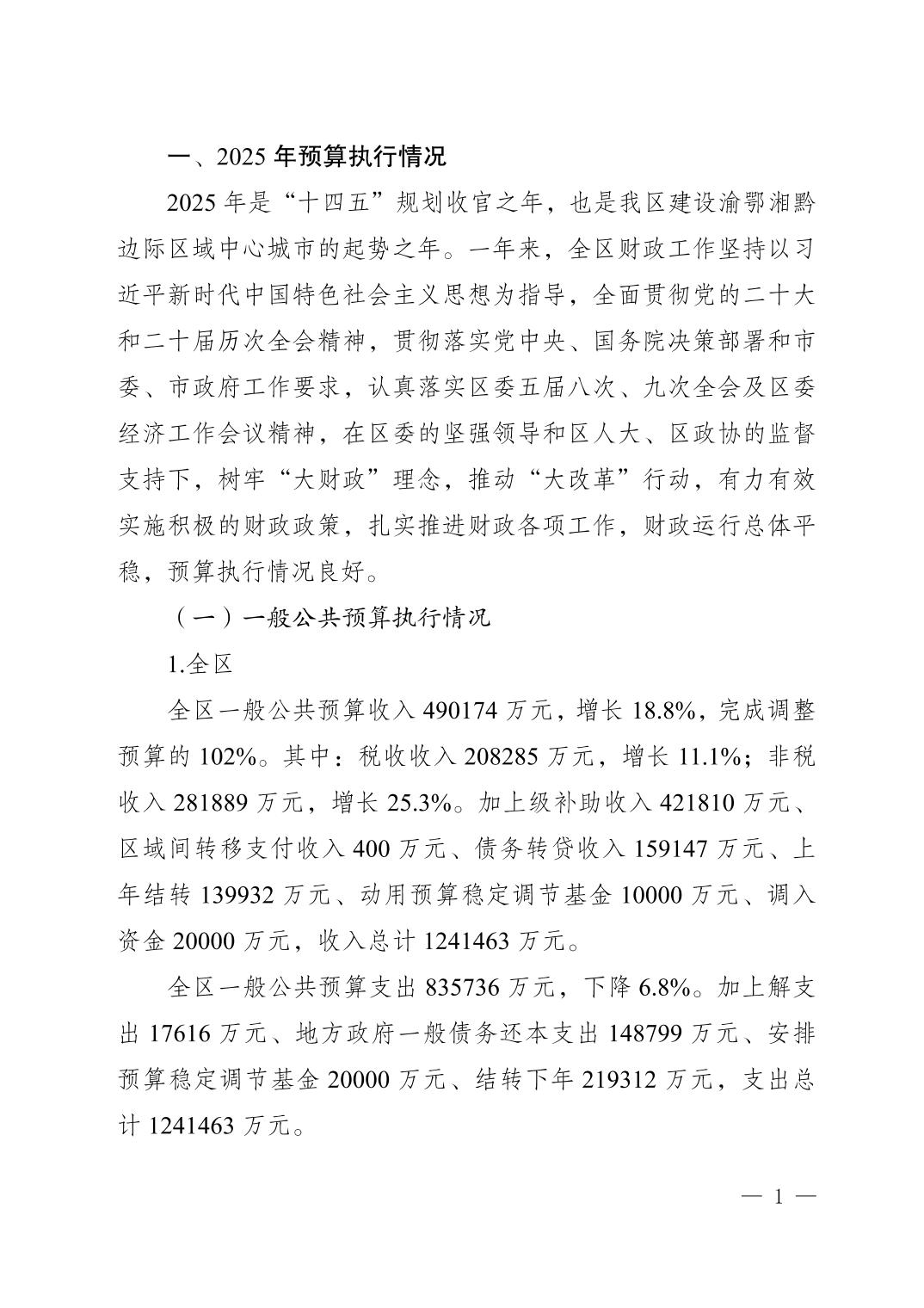 重慶市黔江區2025年預算執行情況和2026年預算草案報告">