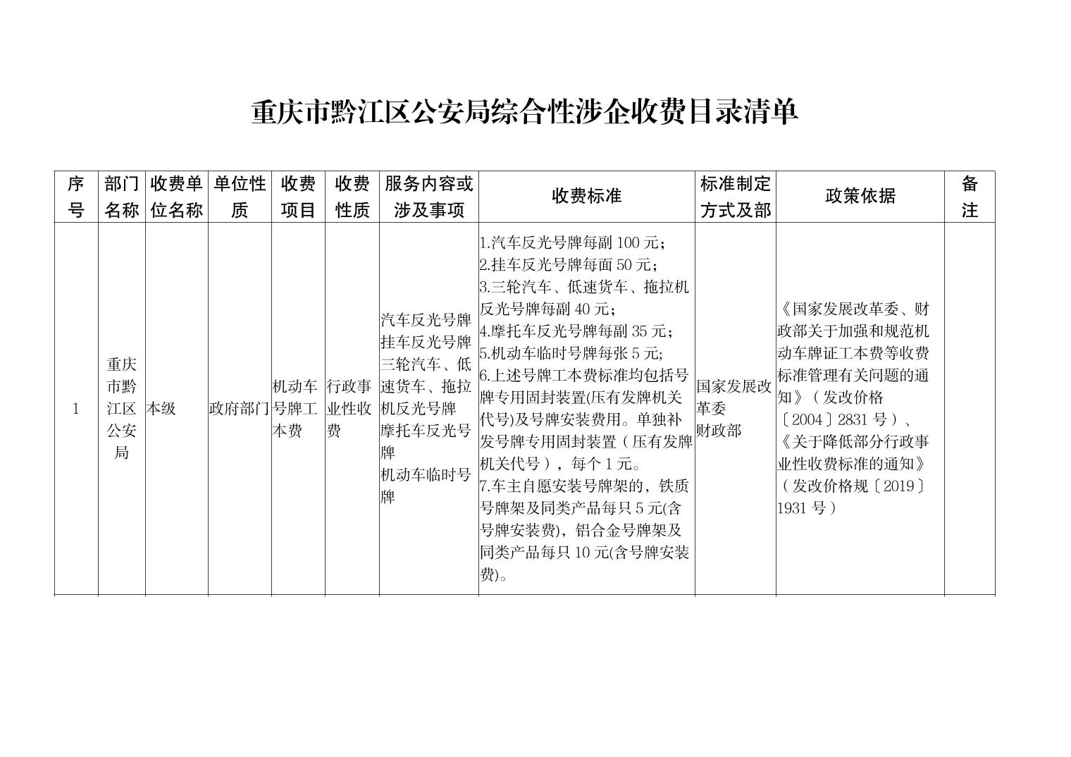重慶市黔江區公安局綜合性涉企收費目錄清單">
