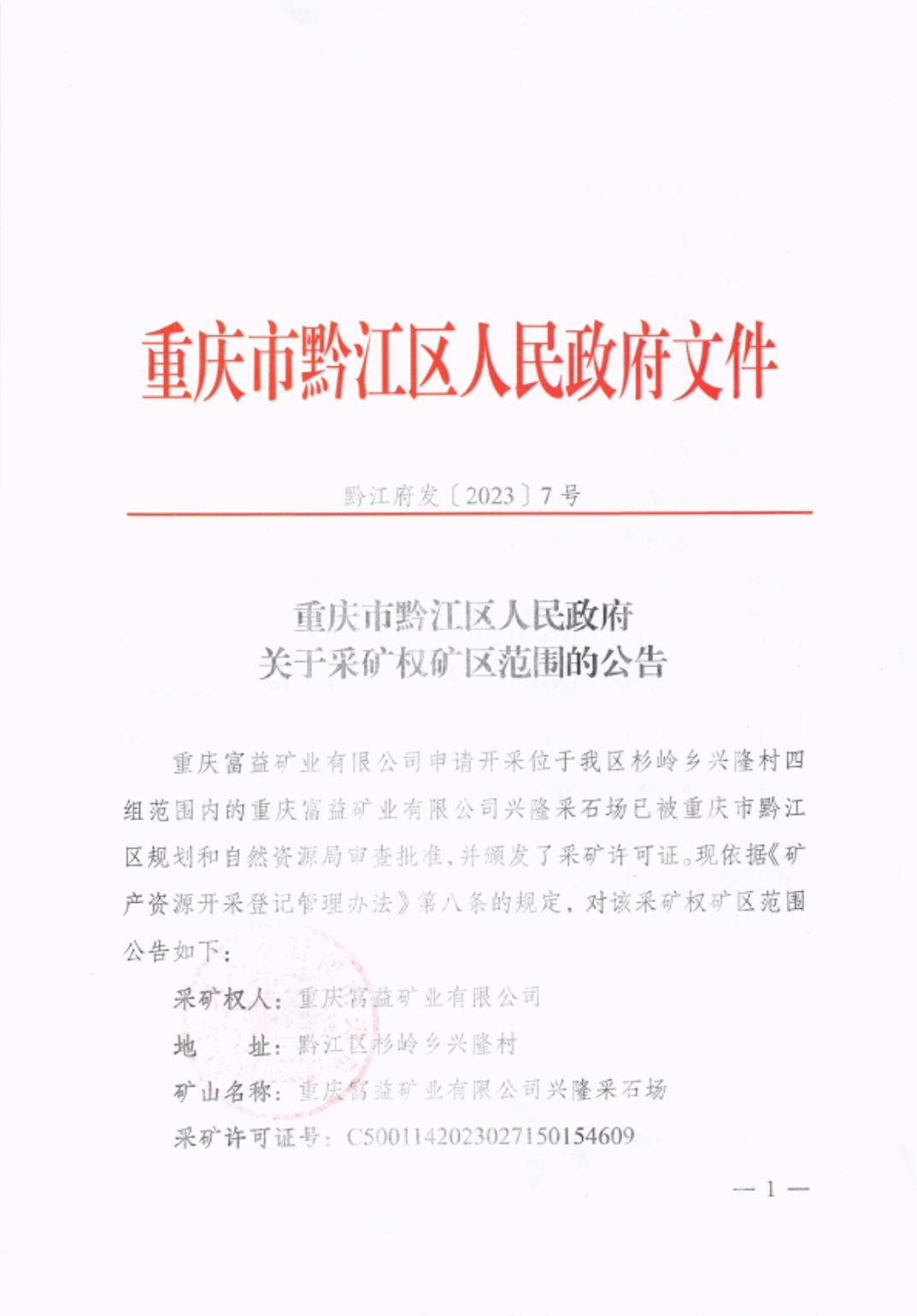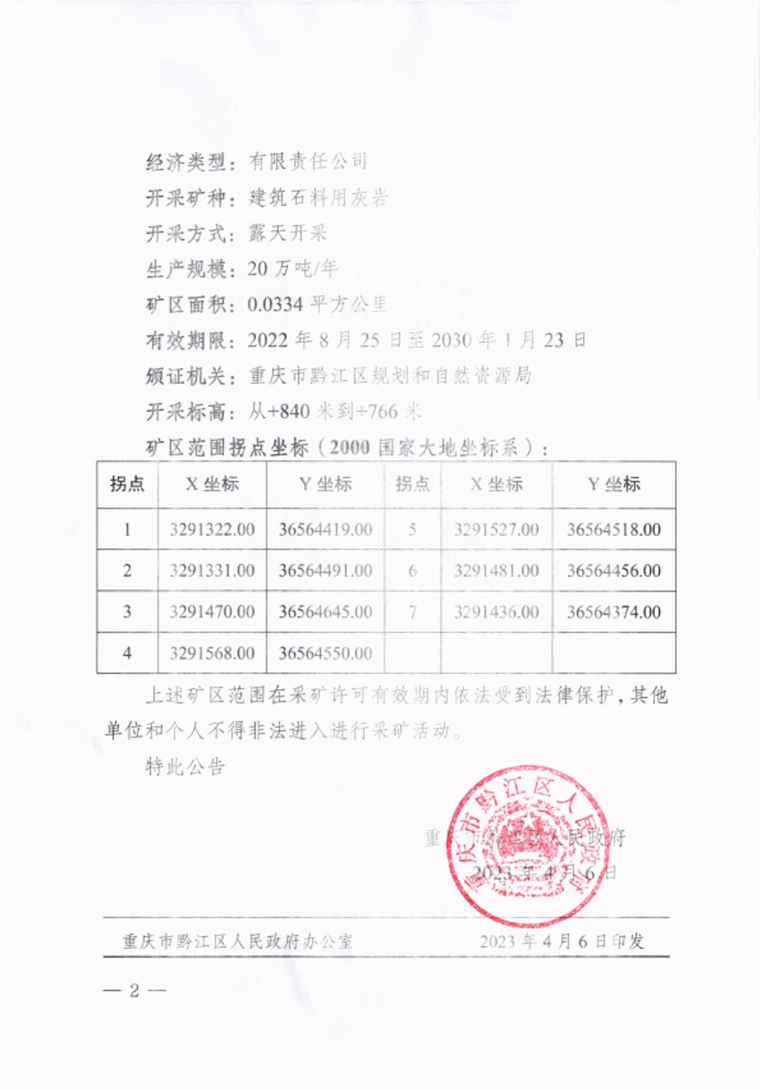重慶市黔江區人民政府 關于采礦權礦區范圍的公告