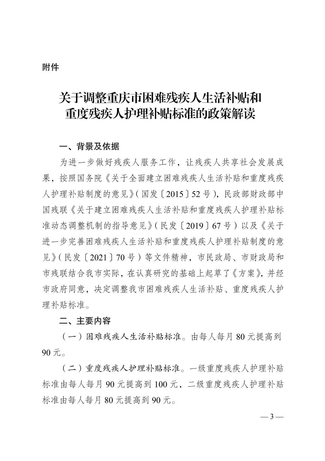 重慶市民政局等三部門關(guān)于調(diào)整重慶市困難殘疾人生活補(bǔ)貼和重度殘疾人護(hù)理補(bǔ)貼標(biāo)準(zhǔn)的通知