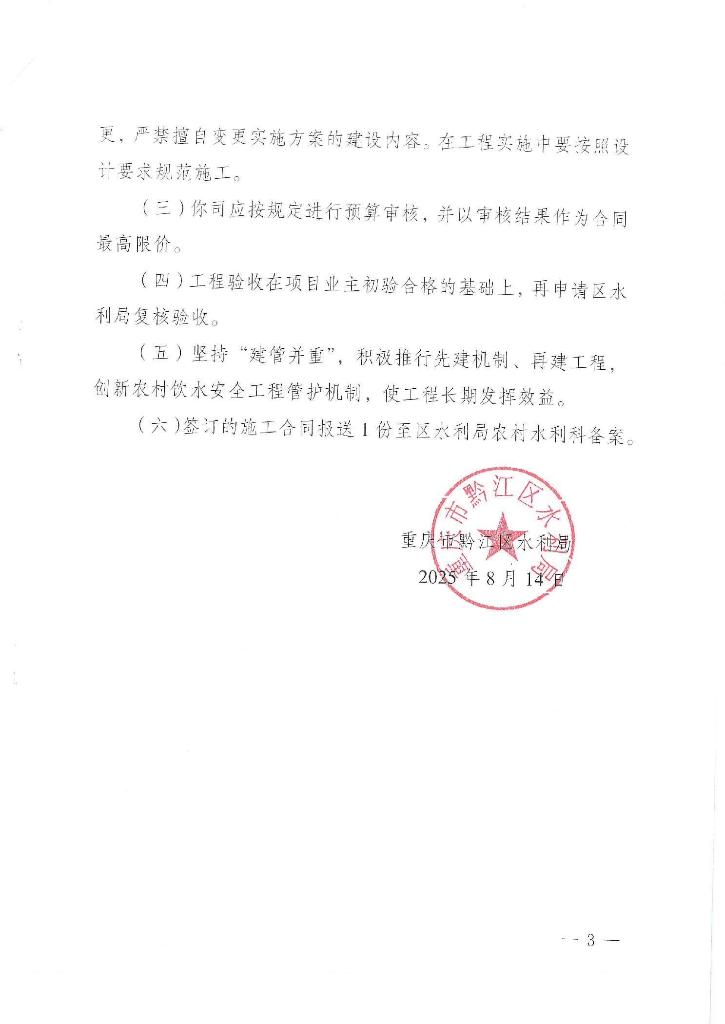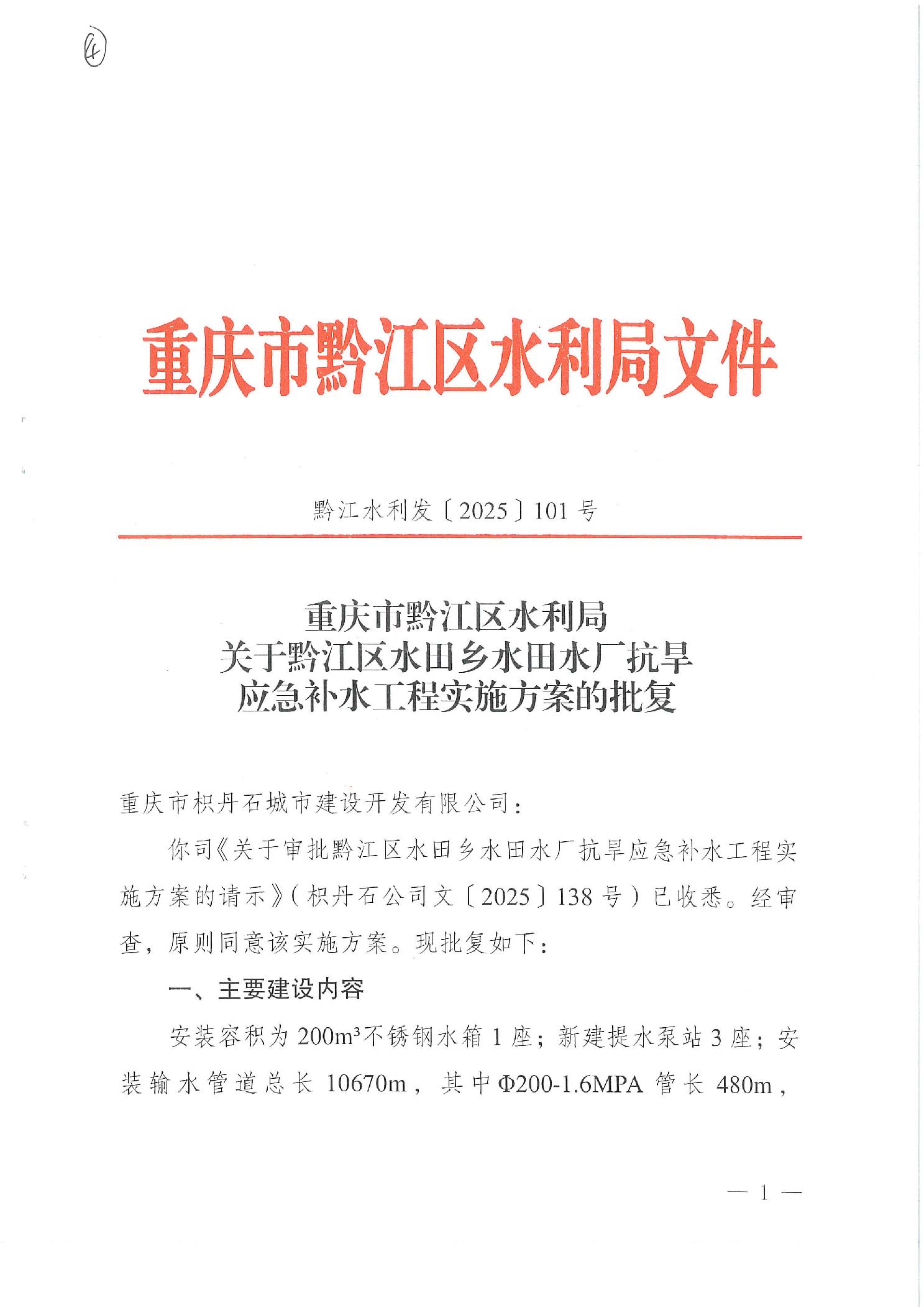關于黔江區水田鄉水田水廠抗旱應急補水工程實施方案的批復