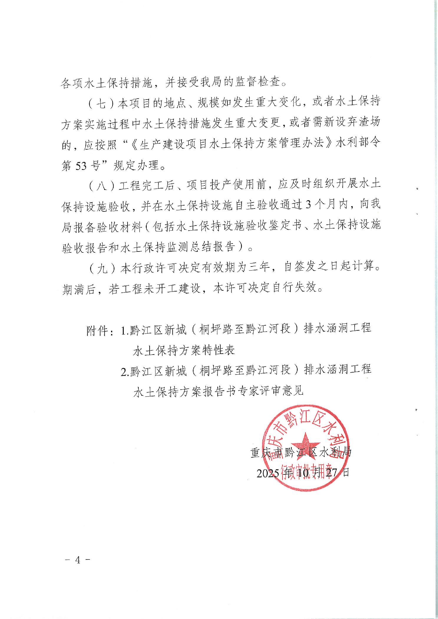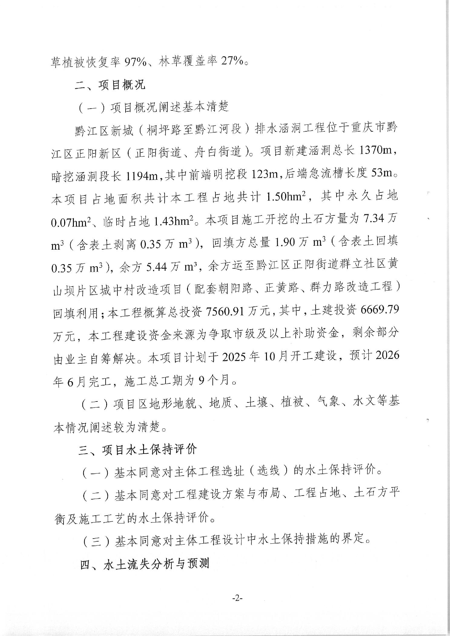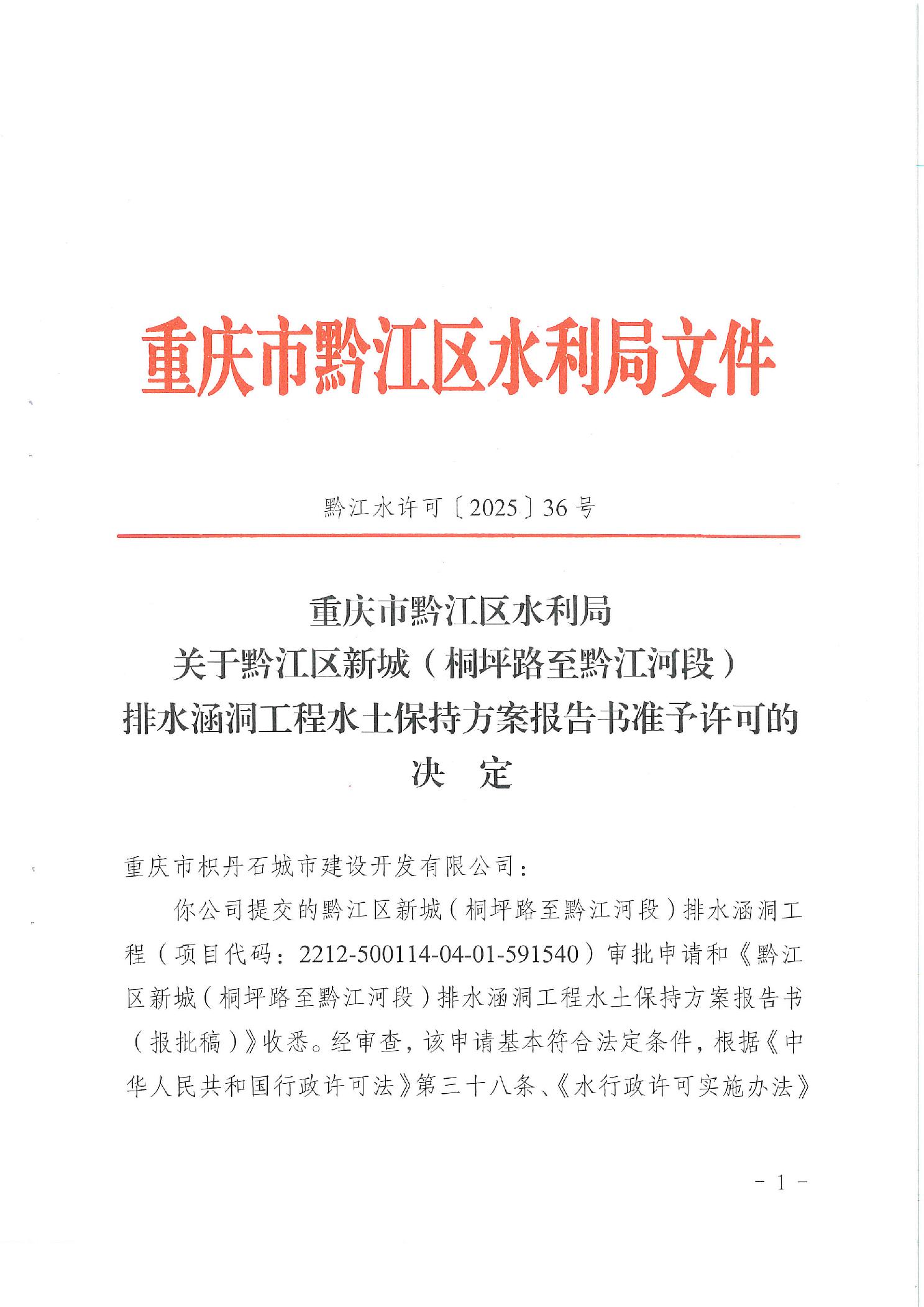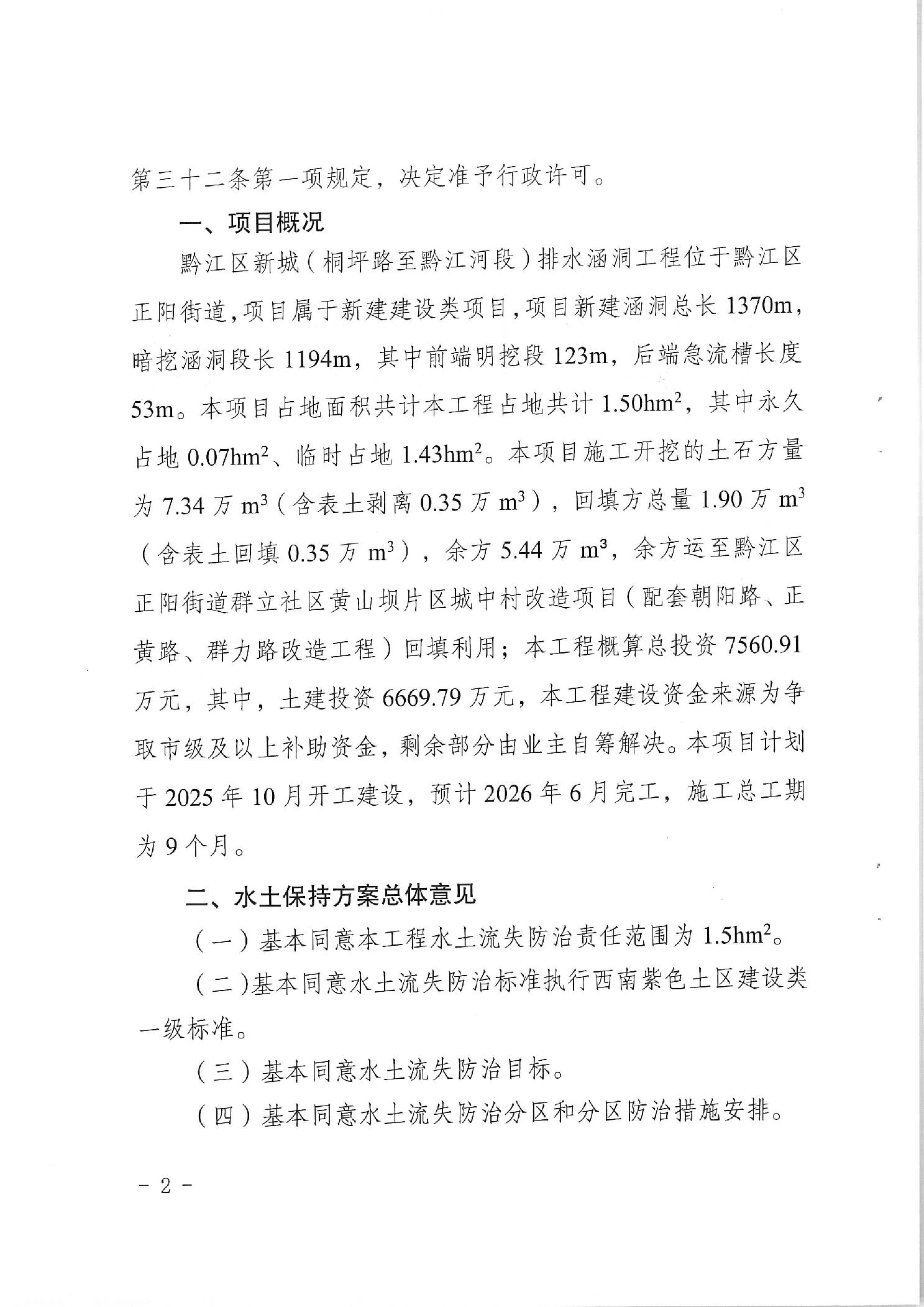 關(guān)于黔江區(qū)新城(桐坪路至黔江河段)排水涵洞工程水土保持方案報(bào)告書準(zhǔn)予許可的決定
