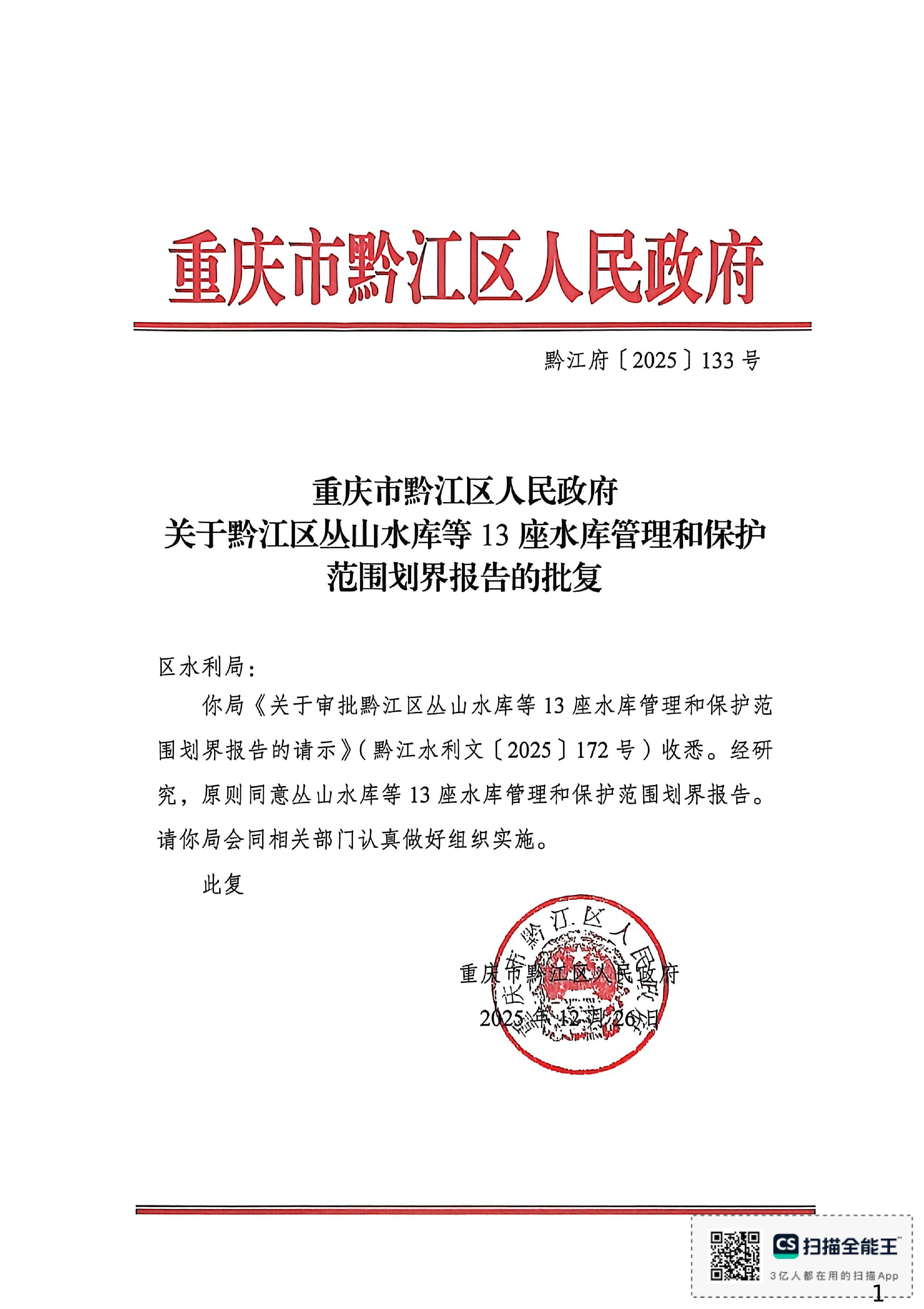 關于黔江區瓦窯堡等14座水庫管理和保護范圍劃界報告的批復">