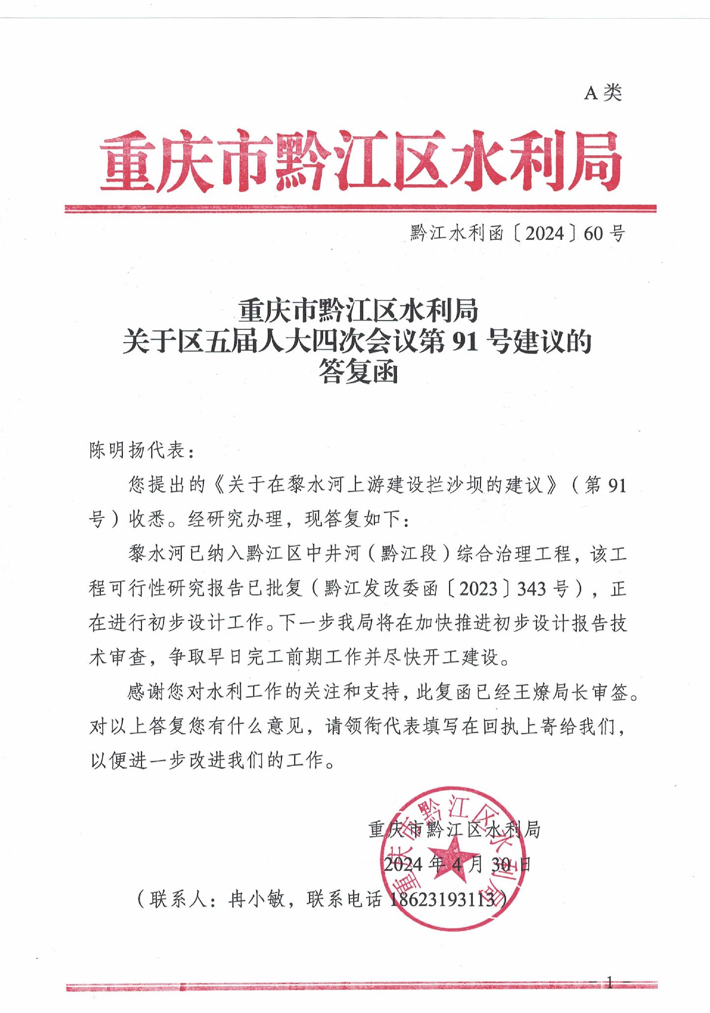 重慶市黔江區水利局關于區五屆人大四次會議第91號建議的答復函