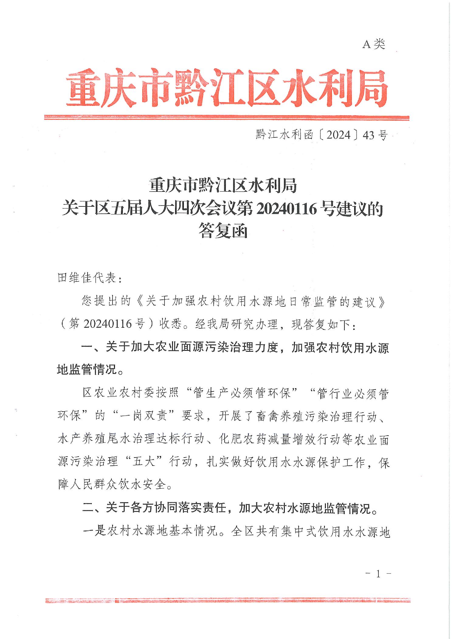 重慶市黔江區水利局關于區五屆人大四次會議第116號建議的答復函