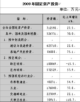 全區全社會固定資產投資完成71.26億元,比上年增長27.5%,其中建設與改造投資完成62.57億元,增長22.8%,基礎設施建設投資 29.57億元,占全社會固定資產投資的 41.5%;房地產開發投資完成8.69億元,增長75.1%。國民經濟各行業中,農林牧漁業投資4.02億元,增長54.9%;工業投資17.6億元,增長37.8%;交通郵電業投資22.30億元,增長22.1%。