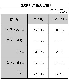年末全區戶籍總人口52.68萬人,比上年增加0.51 萬人。全區常住人口43.86萬人,城鎮化率達到 34.27%,比上年提高1.72個百分點。全區人口自然增長率為5.14‰。