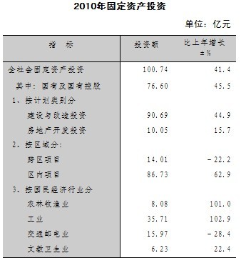全區全社會固定資產投資完成100.74億元,比上年增長41.4%,投資對經濟增長的貢獻率為60%,拉動經濟增長11.9個百分點,其中基礎設施建設投資35.21億元,占全社會固定資產投資的35%。全年完成建設與改造投資90.69億元,增長44.9%,占投資總量的90%;完成房地產開發投資10.05億元,增長15.7%。