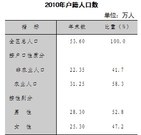 年末全區戶籍總人口53.6萬人,比上年增加0.92萬人。全區非農業人口22.35萬人,農業人口31.25萬人;人口自然增長率為6.1‰。