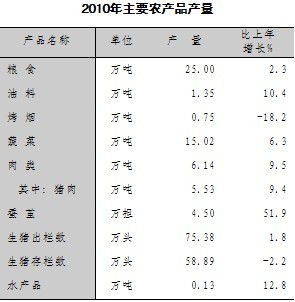 全年肉類總產量達到6.14萬噸,比上年增長9.5%,其中豬肉5.53萬噸,增長9.4%;牛羊肉0.49萬噸,增產12%。年末生豬存欄58.89萬頭,減少2.2%;牛存欄9.53萬頭,增長6.6%;羊存欄2.03萬只,增長8.3%。全年生豬出欄75.38萬頭,增長1.8%。全年水產品產量0.13萬噸,增長12.8%。