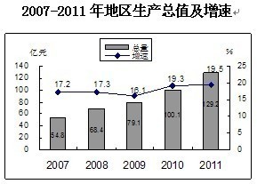 初步核算,2011年全區(qū)實(shí)現(xiàn)地區(qū)生產(chǎn)總值129.19億元,比上年增長19.5%,其中第一產(chǎn)業(yè)實(shí)現(xiàn)增加值13.78億元,增長5.5%;第二產(chǎn)業(yè)增加值71.55億元,增長24.6%;第三產(chǎn)業(yè)增加值43.87億元,增長16.3%。三次產(chǎn)業(yè)比例由上年的10.6∶53.5∶35.9調(diào)整為10.6∶55.4∶34,三次產(chǎn)業(yè)對經(jīng)濟(jì)增長的貢獻(xiàn)率分別為3.1%、66.5%和30.4%。