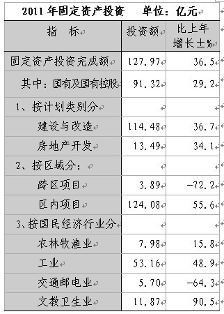 2011年,全區(qū)固定資產(chǎn)投資完成127.97億元,比上年增長36.5%,投資對經(jīng)濟(jì)增長的貢獻(xiàn)率為59%,拉動經(jīng)濟(jì)增長11.5個(gè)百分點(diǎn),其中國有投資實(shí)現(xiàn)91.32億元,占投資總量的71.4%,成為投資增長的主導(dǎo)力量。全年建設(shè)與改造投資完成114.48億元,增長36.7%,占投資總量的89.5%;房地產(chǎn)開發(fā)投資完成13.49億元,增長34.1%。國民經(jīng)濟(jì)各行業(yè)中,農(nóng)林牧漁業(yè)完成投資7.98億元,增長15.8%;工業(yè)完成投資53.16億元,增長48.9%;教育衛(wèi)生文化事業(yè)完成投資11.86億元,增長90.5%。