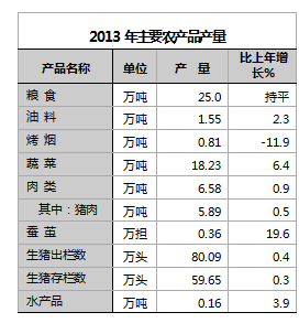 全年肉類總產量達到6.58萬噸,比上年增長0.9%,其中豬肉5.89萬噸,增長 0.5%;牛肉0.51萬噸,增長3.3%。2013年末,生豬存欄59.65萬頭,增長0.3%;牛存欄8.64萬頭,下降9.1%;羊存欄2.31萬只,增長5%;全年生豬出欄80.09萬頭,增長0.4%;全年水產品產量0.16萬噸,增長3.9%。