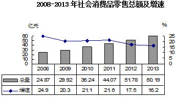 2013年,社會消費品零售總額實現60.19億元,比上年增長16.2%。分地區看,城鎮實現消費品零售額46.22億元,增長16.5%;農村實現消費品零售額13.98億元,增長15.4%。分行業看,批發零售貿易業實現零售額54.17億元,增長16.7%;住宿餐飲業實現零售額6.03 億元,增長12.4%。全區批發零售企業實現商品銷售額94.83億元,比上年增長21.1%,住宿餐飲企業實現營業收入9.16億元,增長15%。