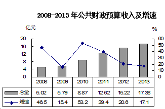 2013年,全區實現財政總收入61.15億元,比上年增長12.2%。公共財政預算收入17.38億元,增長17.1%;實現稅收收入12.35億元,增長20.7%,其中增值稅和營業稅分別增長14.2%和38.2%。公共財政預算支出45.9億元,比上年增長10.7%,其中農林水事務支出增長9.2%,教育支出下降6.2%,醫療衛生支出增長12.5%,社會保障和就業支出增長7.2%,城鄉社區事務支出增長27.4%。