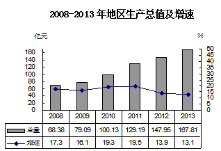 據初步核算,2013年全區實現地區生產總值167.81億元,比上年增長13.1%,其中第一產業實現增加值16.89億元,增長4.1%;第二產業增加值95.29億元,增長14.6%;第三產業增加值55.64億元,增長12.8%。