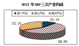 產業結構調整成效明顯,三次產業的比例由2012年的10.5∶56.2∶33.3調整為10.1:56.8:33.1,三次產業對經濟增長的貢獻率分別為2.7%、64.1%和33.2%。