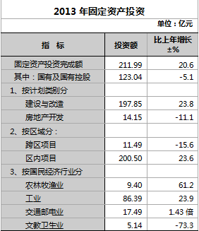 2013年,全區固定資產投資完成211.99億元,比上年增長20.6%,其中國有投資實現123.04億元,占投資總量的58%。全年建設與改造投資完成197.85億元,增長23.8%,占投資總量的93.3%;房地產開發投資完成14.15億元,下降11.1%。國民經濟各行業中,農林牧漁業完成投資9.4億元,增長61.2%;工業完成投資86.39億元,增長23.9%;教育衛生文化事業完成投資5.14億元,下降73.3%。
