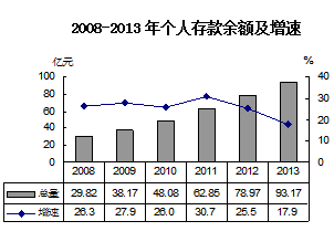 2013年末,金融機構存款余額165.47億元,比上年增長19.5%,其中個人存款余額93.17億元,增長17.9%。金融機構貸款余額126.5億元,增長35.9%,其中短期貸款45.97億元,增長62.1%,中長期貸款79.79億元,增長24.5%。