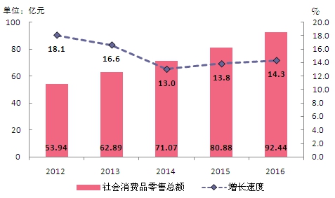 全年社會消費品零售總額92.44億元,比上年增長14.3%。按經營地分,城鎮消費品零售額71.38億元,增長14.4%;農村消費品零售額21.06億元,增長14%。按行業分,批發零售貿易業零售額83.08億元,增長14.3%;住宿餐飲業零售額9.36億元,增長14.3%。
