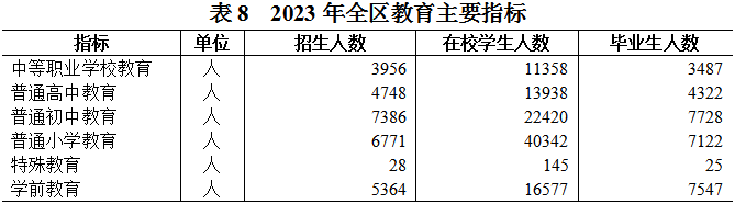 全區共有普通高等教育學校2所,中等職業學校2所,普通中學27所,普通小學49所,幼兒園130所,特殊教育學校1所。高中階段教育毛入學率98.5%,初中入學率100%,小學入學率100%,學前教育三年毛入園率92.1%。學前教育普惠率95.2%。九年義務教育鞏固率100%。?????????????