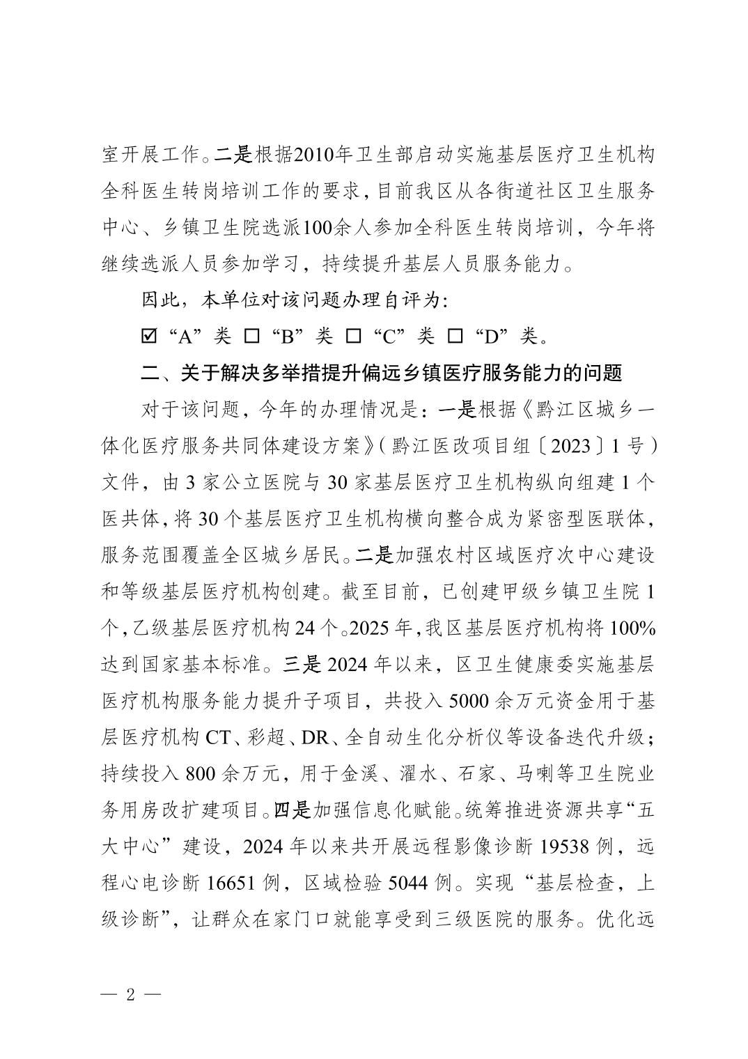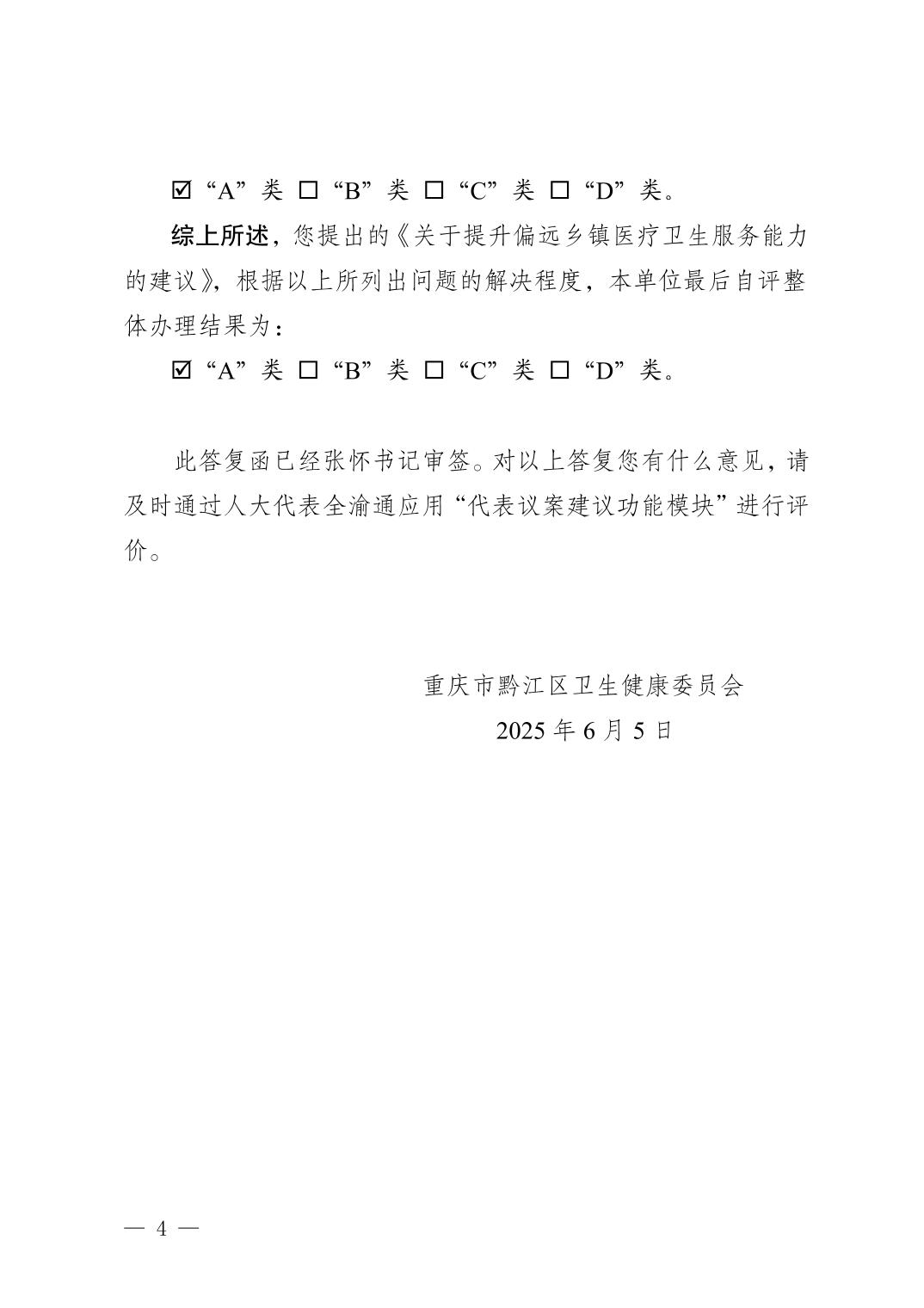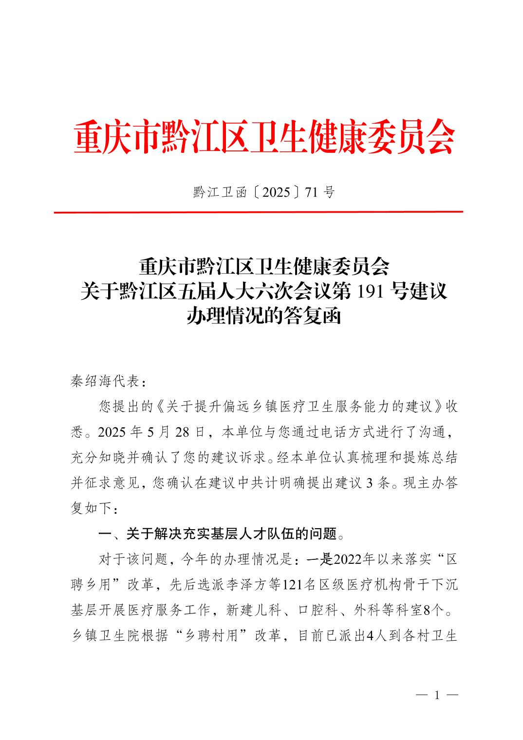 重慶市黔江區(qū)衛(wèi)生健康委員會關(guān)于黔江區(qū)五屆人大六次會議第191號建議辦理情況的答復(fù)函