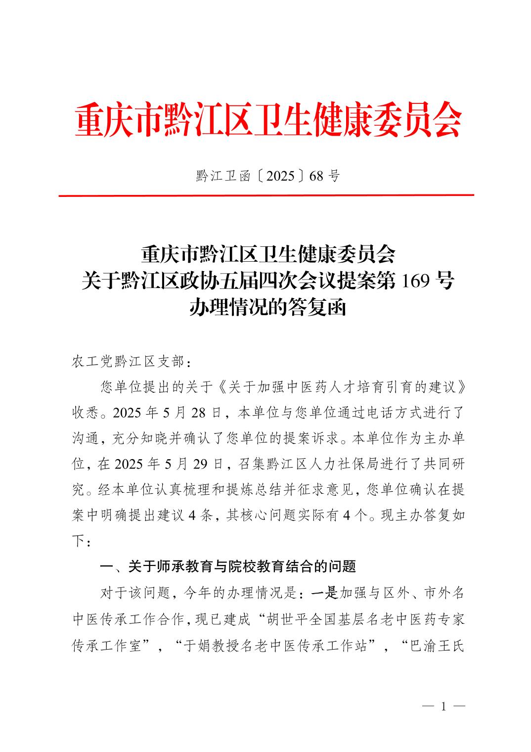 重慶市黔江區衛生健康委員會關于黔江區政協五屆四次會議提案第169號辦理情況的答復函