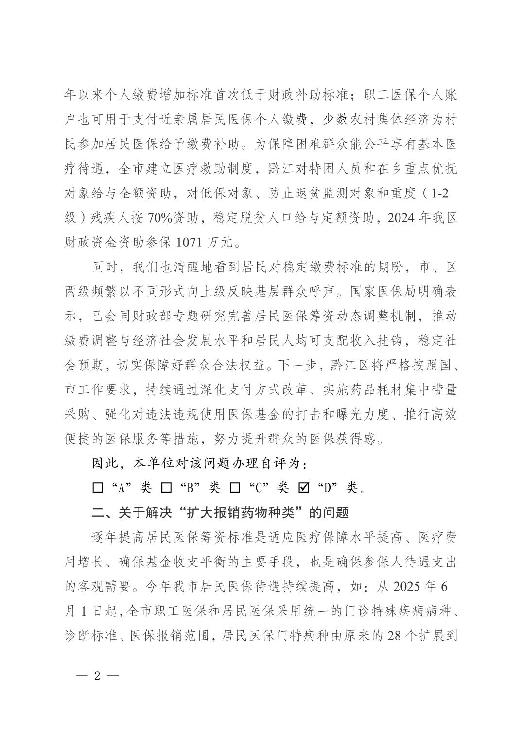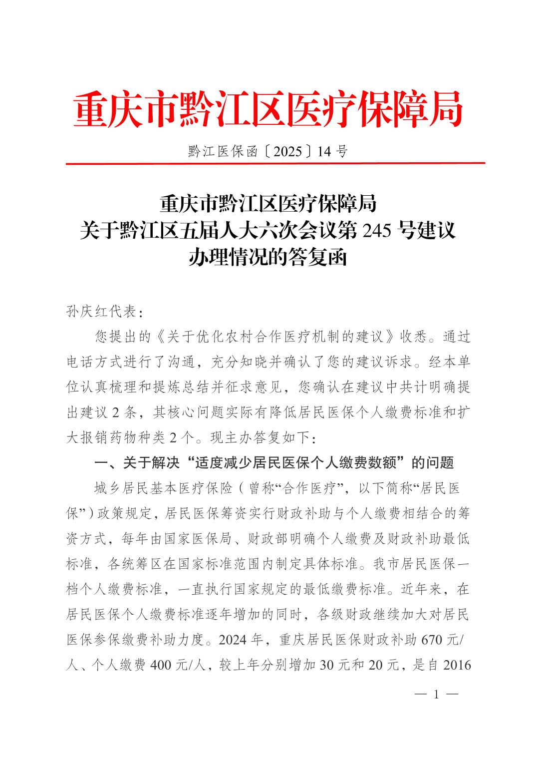 重慶市黔江區(qū)醫(yī)療保障局關(guān)于黔江區(qū)五屆人大六次會(huì)議第245號(hào)建議辦理情況的答復(fù)函