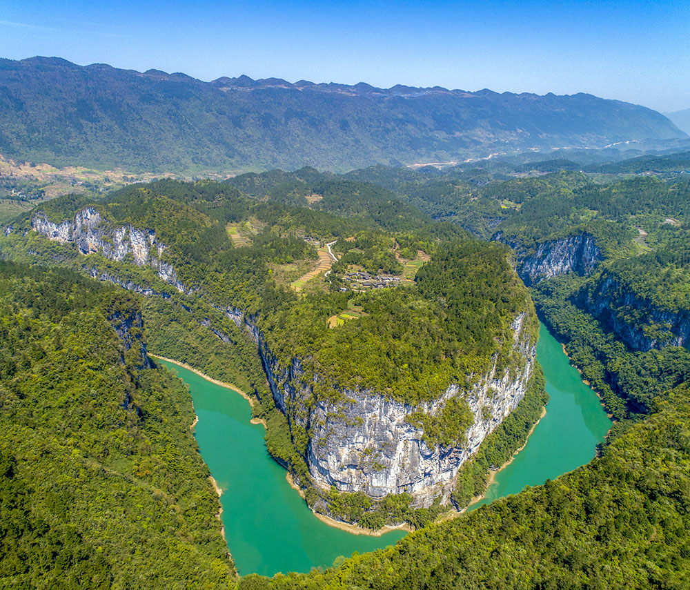 神龜峽位于阿蓬江下游,是國家4A級旅游景區,因峽口兩山酷似雌雄雙龜對臥而得名。兩岸高山絕壁,河道斗折蛇行,形成了天門、巨佛、三郎峰、石壁畫廊、薄刀嶺等奇特景觀,盡顯自然的鬼斧神工。沿途絕壁夾江,全程有27個彎,有神門、天門、人門等28個門,其彎道之多,實屬峽谷罕見。峽谷兩岸茂林修竹,植被原始古樸,生態優美。兩岸不時有飛瀑奔瀉而下,情趣飄逸。富顯詩情畫意,是舞文的書齋,揮毫的畫卷,科考的著床。