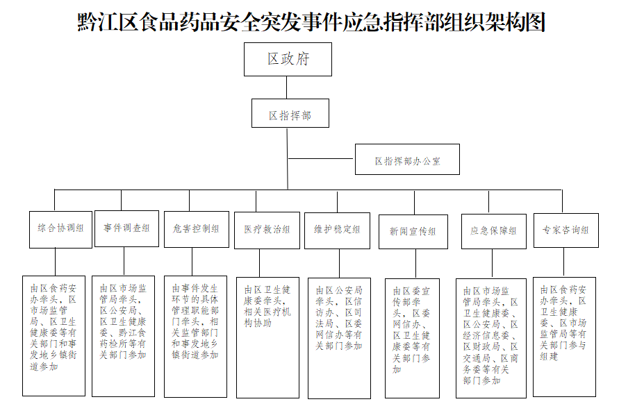 區應急指揮部成員單位根據事件的性質和應急處置工作的需要確定,主要成員單位有:區委辦公室、區政府辦公室、區委宣傳部、區發展改革委、區教委、區經濟信息委、區公安局、區民政局、區司法局、區財政局、區生態環境局、區住房城鄉建委、區城市管理局、區交通局、區農業農村委、區商務委、區文化旅游委、區衛生健康委、區應急局、區市場監管局、區醫保局,區法院、區檢察院,黔江食藥檢所,各鄉鎮人民政府、各街道辦事處。