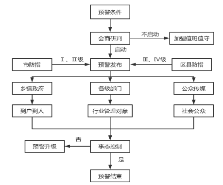 Ⅰ級、Ⅱ級、Ⅲ級、Ⅳ級預警分別由區防指指揮長、常務副指揮長、副指揮長和防辦主任組織會商,研判水旱災害。