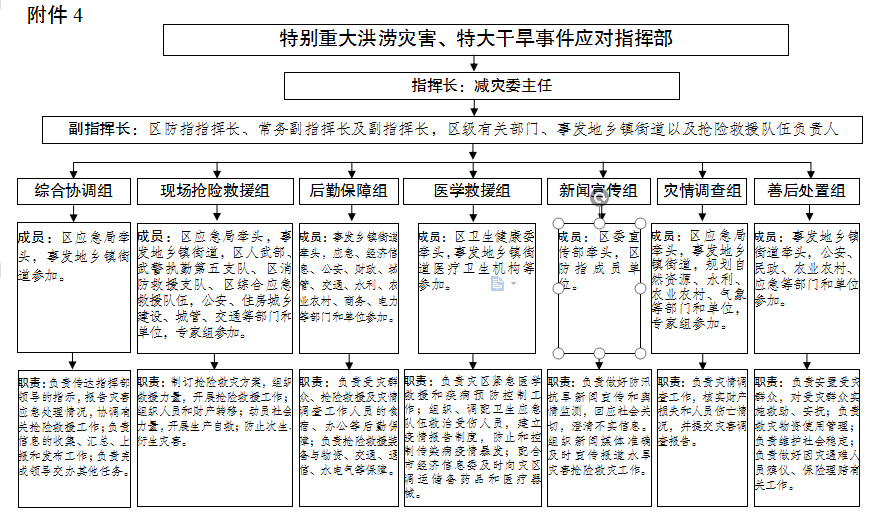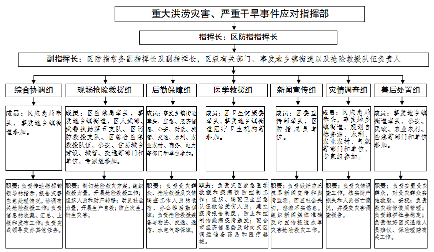 啟動Ⅲ級及以上應急響應或發生較大以上災險情,區防指應當成立事件應對指揮部,統一領導、組織指揮應急處置工作;事件應對指揮部實行指揮長負責制,由區政府有關領導任指揮長,下設綜合協調、搶險救援、后勤保障、醫學救援、新聞宣傳、災情調查、善后處置等工作組(見附件4)。