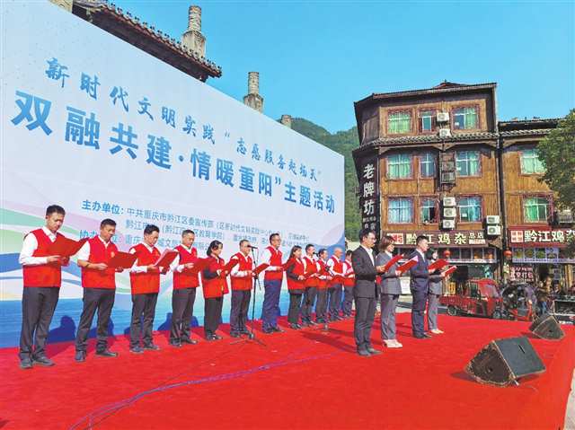 由黔江區委宣傳部組織開展的“雙融共建·情暖重陽”新時代文明實踐“趕場天”活動,志愿者集體朗誦《文明行》