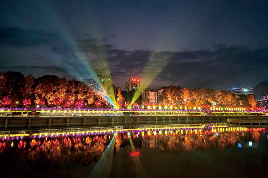 七條城市干道化身光影廊道。迎賓大道、新華大道、正舟路等主干道通過連貫的燈帶與節點燈飾,串聯起城市脈絡,形成流動的風景線。